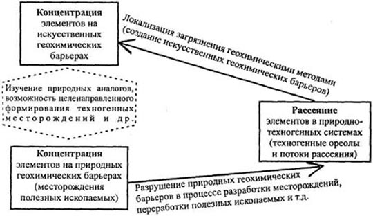 Месторождения полезных ископаемых представляют собой природные геохимические барьеры , на которых формируются концентрации элементов. Разработка месторождений и переработка полезных ископаемых, приводит к разрушению этих барьеров. Негативным следствием этого процесса, является неконтролируемая миграция элементов или загрязнение окружающей среды. В районах расположения источников загрязнения формируются техногенные ореолы и потоки рассеяния.