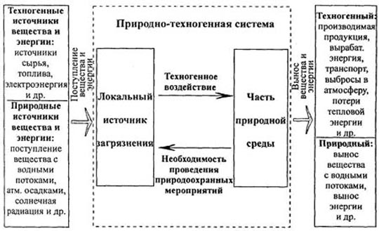 В рассматриваемых системах можно противопоставить две основных части: техногенную— локальный источник загрязнения, и природную— часть природной среды, на которую оказывается или предполагается воздействие этого источника. Также можно выделить основные связи между частями, объединяющие систему в единое целое. Прямой связью является техногенное воздействие источника загрязнения на часть природной среды, приводящее к ее изменению. Если такое изменение становится неблагоприятным для человека и биотических компонентов, то возникает отрицательная обратная связь, выраженная в необходимости снижения техногенного воздействия.