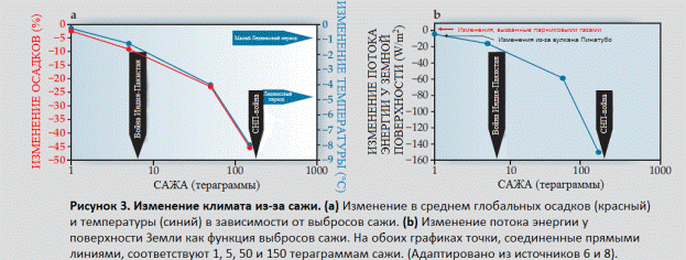 В результате извержения вулкана Пинатубо максимальное изменение потока энергии кратковременно достигало около -4 Вт/м2 (знак минус означает, что поток уменьшился). Одним из выводов по рисунку является факт, что даже региональная война между Индией и Пакистаном может вызвать изменения климата в гораздо большей степени, чем в результате воздействия парниковых газов, которые являются предметом больших опасений по части изменения климата в обозримом будущем.