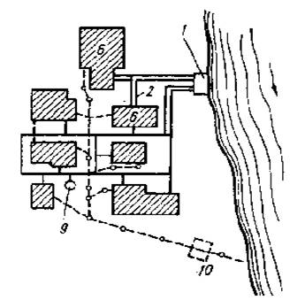 1 – водоприемник с совмещенной насосной станцией; 2 – водоводы; 6 – цех, где вода используется для охлаждения; 9 – водонапорная башня; 10 – канализационные очистные сооружения