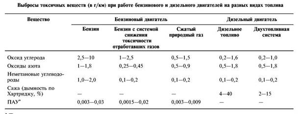 В отличие от жидких топлив достаточно полное сгорание метана происходит при большем избытке воздуха, что способствует снижению эмиссии оксидов азота и продуктов неполного сгорания. В табл. 6 приведена сравнительная оценка удельных выбросов токсичных веществ, образующихся при работе двигателя легкового автомобиля общей массой 1,5 т при использовании различных видов топлива.