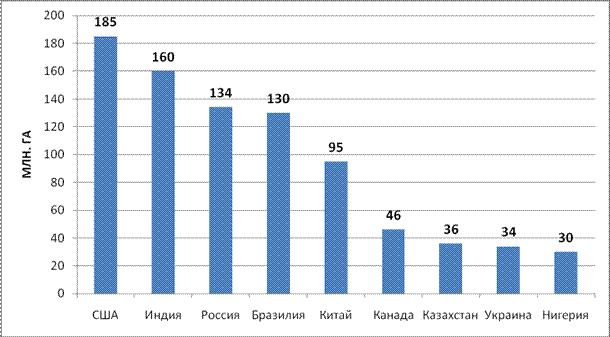 Сельскохозяйственные угодья, т.е. земли, используемые для производства продуктов питания, включают пашни, многолетние насаждения (сады, плантации), естественные луга и пастбища. В настоящее время общая площадь сельскохозяйственных угодий составляет 48,1 млн. кв. км (4810 млн. га), в том числе пашни (обрабатываемые земли) – 1340 млн. га, луга и пастбища – 3365 млн. га. Наибольшими размерами пашни выделяются США, Индия, Россия, Китай, Канада, Казахстан, Украина (см. рис. 1).