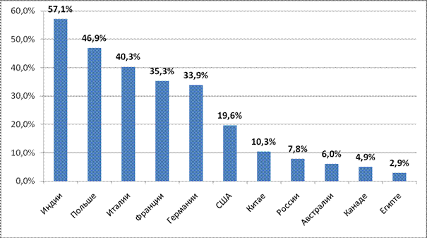 Рис. 2. Крупнейшие страны мира по долям обрабатываемых земель.[3]