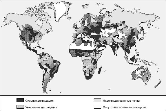 Под деградацией (от лат. gradus – ступень и приставки de, означающей движение вниз) земельного, почвенного покрова понимают процесс его ухудшения и разрушения в результате негативного воздействия человеческой деятельности. Такая деградация происходила на протяжении всей истории человечества. Ученые подсчитали, что в результате нерационального землепользования человечество за исторический период своего развития уже потеряло от 1,5 млрд до 2 млрд га некогда продуктивных земель, т. е. больше, чем вся современная площадь пашни. И в наши дни в результате деградации почвы из мирового сельскохозяйственного оборота ежегодно выбывает в среднем 8-10 млн, а по максимальным оценкам – даже 15-20 млн га продуктивных земель. Они превращаются в пустоши или пустыни либо идут под застройку.