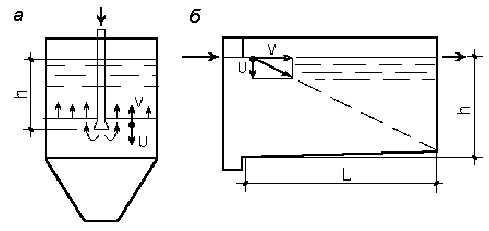 Схема осаждения в отстойниках: а – вертикальный; б – горизонтальный