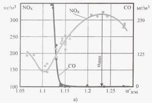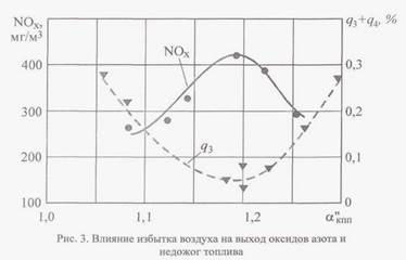 Влияние избытков воздуха на образование оксидов азота описывается экстремальной зависимостью с максимумом при аma х = 1,15-1,25 для газомазутных котлов и аm ах = 1,4-1,5 для пылеугольных котлов в зависимости от конструкции горелочных устройств и состояния топочной камеры (рис. 2). Причем максимум содержания NOx в дымовых газах соответствует такому значению коэффициента избытка воздуха, при котором в данных условиях достигается наиболее полное сгорание топлива (рис.3).