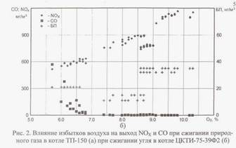 Следует особо подчеркнуть, что в образовании оксидов азота участвует только тот воздух, который подается в зону активного горения вместе с топливом. Изменение количества присосов холодного воздуха в топочную камеру, который не участвует в процессе воспламенения и горения топлива, практически не влияет на образование оксидов азота. Поэтому при одинаковых значениях коэффициента избытка воздуха на выходе из топки ат из-за разных присосов избытки воздуха в ЗАГ могут существенно отличаться. Это, в свою очередь, приводит к разному выходу NOX . Кроме того, чрезмерное снижение избытков воздуха в зоне горения сопровождается не только повышенным недожогом топлива, но и увеличением выхода NOX за счет появления быстрых оксидов азота (левая ветвь зависимости NOX на рис. 2а).
