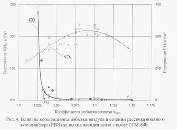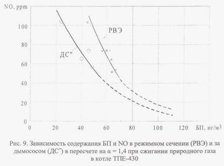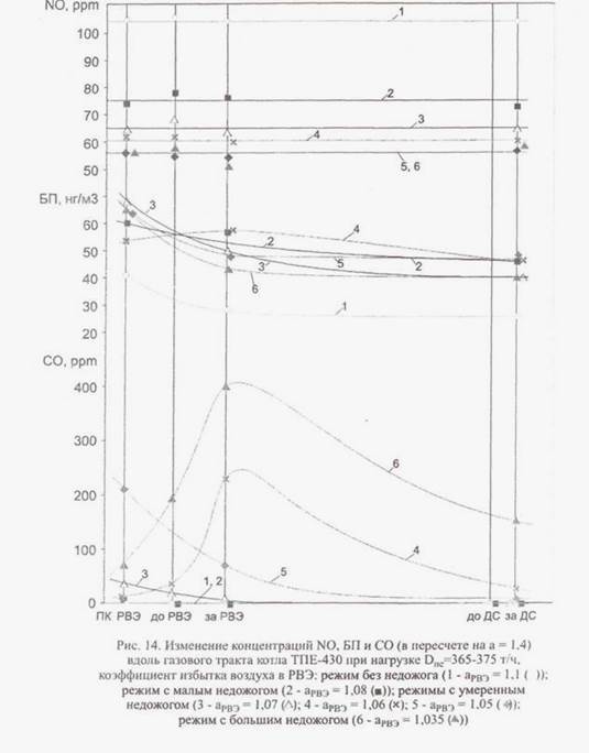 Режимы с большим недожогом или режимы с большим затягиванием процесса горения (рис. 10г) характеризуются повышенными концентрациями БП и относительно невысоким содержанием СО (от 10 до 100 ррm или 12,5-125 мг/м3 ) в режимном сечении (рис. 13). Далее по тракту в результате интенсивного выгорания углеводородов происходит резкое увеличение выхода СО, содержание которого может достигать значений несколько сотен мг/м3. Затягивание процесса горения из-за недостатка воздуха в топочной камере настолько велико, что на оставшемся участке газового тракта котельной установки, несмотря на присосы воздуха, СО не успевает полностью окислится до СО2 . В результате концентрации СО в сечении за дымососом могут достигать значений 150 - 400 ррm (187,5-500 мг/м3 ) и выше. Естественно, что режимы с большим недожогом, даже не смотря на существенное (40 - 50%) снижение выхода оксидов азота (рис. 5), не могут быть рекомендованы в качестве эксплуатационных из-за пониженной эффективности сжигания топлива, заноса поверхностей нагрева сажистыми частицами и проч.