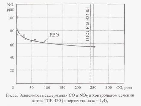 Еще больший эффект снижения выбросов оксидов азота, как показали результаты экспериментов, наблюдается при дальнейшем снижении а ниже значений араб вплоть до появления химического недожога (см. табл. 2). Причем основное снижение эмиссии NOX происходит уже при появлении умеренного недожога топлива (рис. 5). Так, повышение химического недожога, сопровождавшееся ростом концентрации СО в продуктах сгорания (в контрольном сечении, в данном случае сечение РВЭ) от 0 до 50 ррm (62,5 мг/м3), приводило к снижению содержания оксидов азота на 25 - 30%. При дальнейшем увеличении недожога, когда содержание СО увеличивалось с 50 ррm до нормативных значений (300 мг/м3 или 240 ррm), происходило дополнительное линейное снижение выхода NOX на 10 - 12% от первоначального значения.