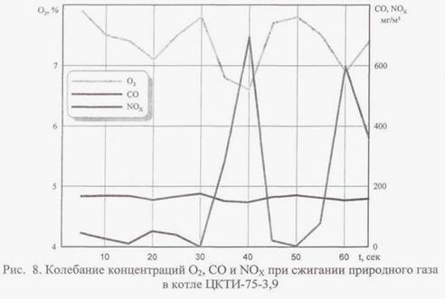 Следует особо отметить, что на многих котлах наблюдается значительные колебания концентрации кислорода в продуктах сгорания. Это может быть связано как с работой автоматики, так и с плохим техническим состоянием котельного агрегата. Так, например, на котле ЦКТИ-75-3,9, установленном на ТЭЦ ОАО "ЧМЗ" наблюдались колебания концентрации О2 в уходящих газах в диапазоне 6,8-7,8% об, при этом при попытке наладить режим с контролируемым недожогом концентрация СО составляла от 0 до 700 мг/м3 (рис. 8). В связи с этим для подобных котлов требуется проведение предварительных работ по уплотнению и настройке АСР.