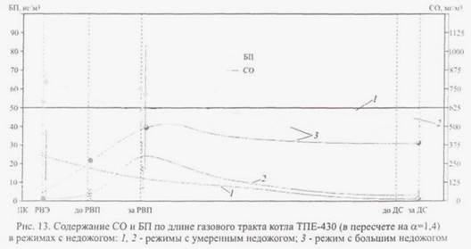 При этом величина химического недожога должна быть ограничена содержанием вредных примесей в дымовых газах за дымососом (в пересчете на а = 1,4): для СО - не более 100 ррm (125 мг/м3 ) и для БП - 60 - 100 нг/м3 .