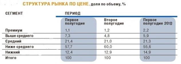 Существует тенденция увеличения продаж в самом маленьком премиальном сегменте – 2,2% в первом полугодии 2010 года против 1,1% в первом полугодии 2009 года, которое происходит в том числе и благодаря появлению на российском рынке новых марок. Около 80% от продаж всего премиального сегмента приходится на Москву, поэтому его удельный вес в структуре продаж столицы значительно больше, чем в среднем по исследуемым городам, в которых, наоборот, повышена доля более дешевых сегментов. Доля сегмента выше среднего заметно сократилась ко второму полугодию 2009 года.
