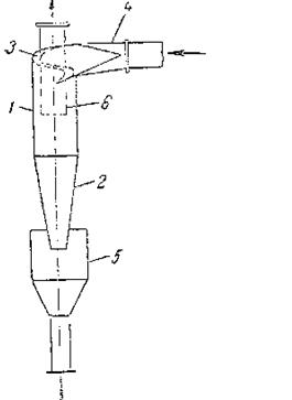 Рис. 1. Циклон конструкции НИИОгаз. 1 – корпус; 2 – коническое днище; 3 – крышка; 4 – входной патрубок; 5 – пылесборник; 6 – выхлопная труба.