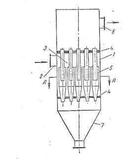 На рис. 2 показан батарейный циклон , состоящий из параллельно работающих циклонных элементов, смонтированных в общем корпусе 1. Запыленный газ через входной патрубок 2 попадает в газораспределительную камеру 3, ограниченную трубными решетками 4, в которых герметично закреплены циклонные элементы 5 . Газ равномерно распределяется по отдельным элементам, действие которых основано на том же принципе, что и работа обычных циклонов. Очищенный газ выходит из элементов в общую камеру и удаляется через патрубок 6. Пыль собирается в коническом днище (бункере) 7 .