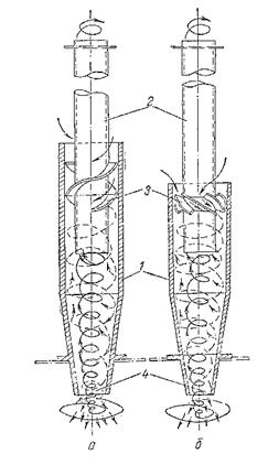 Устройство циклонных элементов показано на рис. 3. Газ поступает в элементы не тангенциально, а сверху через кольцевое пространство между корпусом 1 и выхлопной трубой 2. В кольцевом зазоре установлено закручивающее лопастное устройство 3 в виде «винта» (рис. 3, а), имеющего две лопасти, наклоненные под углом 25°, или «розетки» (рис. 3, б) с восемью лопатками, расположенными под углом 25° или 30°. При помощи такого устройства обеспечивается вращение газового потока. Пыль из элемента ссыпается через пылеотводящий патрубок 4 в общую пылесборную камеру аппарата.