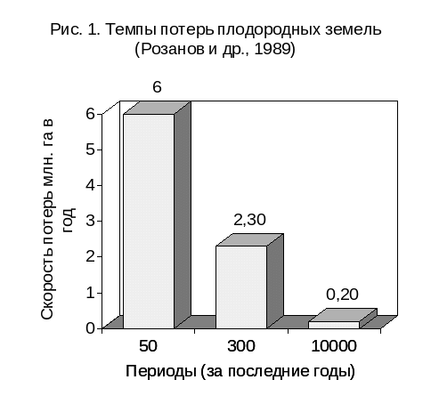 Использование земельных угодий человеком всегда сопровождалось потерей продуктивных земель. По данным Б.Г. Розанова и др. (1989), за последние десять тысяч лет было потеряно 2000 млн. га (в среднем 0.2 млн. га в год). На последние 300 лет приходится потеря 700 млн. га (2.3 млн. га в год). За последние 50 лет выпали из использования 300 млн. га (6 млн. га в год). Таким образом, за период существования земледелия скорость потери возросла в 50 раз. Темпы потерь плодородных земель представлены на рис 1.