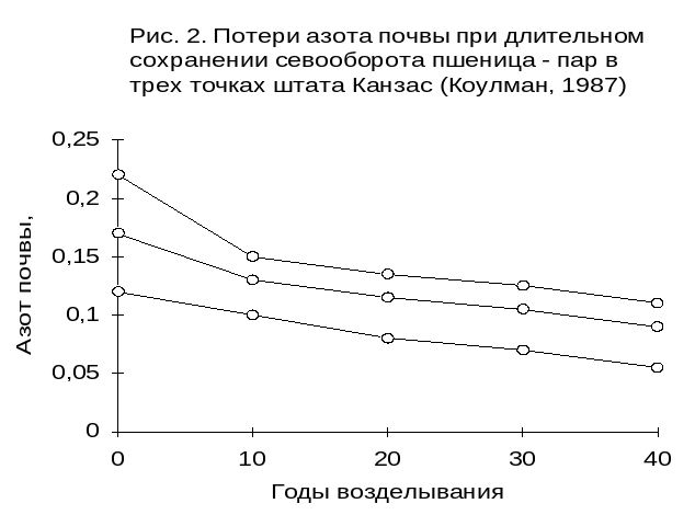 На рис. 2 можно проследить, как происходит обеднение почв по содержанию азота при длительном сохранении севооборота пшеница-пар.