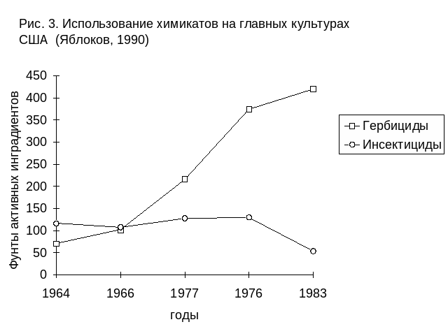 Немногим лучше обстоит дело и с сорными растениями, в популяциях которых сравнительно недавно обнаружились экотипы, устойчивые к гербицидам. В итоге, видов-засорителей стало меньше, но экземпляров засорителей больше. Примерно также обстоит дело с использованием фунгицидов. На рис. 3 можно видеть количественную динамику применения химикатов за последние годы. Примечательно, что применение гербицидов растет быстрее по сравнению с инсектицидами, что отражает большую эффективность их использования и появление целого ряда малотоксичных и быстроразлагающихся в почве гербицидов, заменяющих агротехнические приемы при минимальной обработке почвы. После осознания бессмысленности дальнейшего наращивания применения химических средств борьбы с насекомыми резко упала роль инсектицидов.