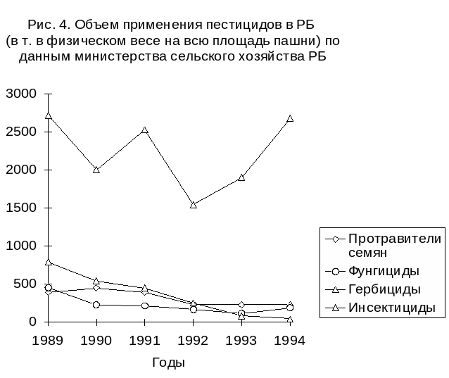 Несколько иначе обстоят дела с объемами применения пестицидов в нашей республике. Как видно из рис. 4, за последние годы прослеживается резкое падение объемов применения ядохимикатов. Однако это не результат целенаправленной экологизации сельского хозяйства в РБ. Причина падения в настоящее время - отсутствие денег у сельхозпроизводителей на покупку нужного количества химикатов.