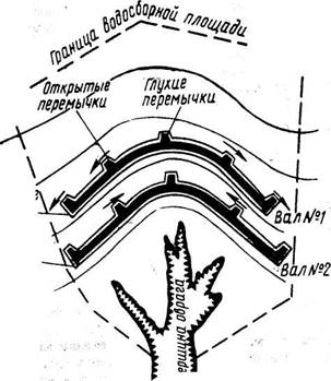 Водоотводящие валы и канавы сооружают поперек склона перед вершиной оврага для перехвата и отведения стока в безопасное место. Принципиальное отличие этих сооружений от водозадерживающих валов в том, что они не имеют перемычек и шпор и размещаются под небольшим углом к горизонталям. Крутизна падения русел этих сооружений не превышает 0,5 - 2°.Это обеспечивает замедление скорости потока воды до такой степени, что не вызывает размыва. Рост вершины оврага может быть приостановлен устройством водозадерживающих валов в сочетании с водоотводящими валами и канавами. В этом случае водоотводящие сооружения располагаются между вершиной оврага и первым водозадерживающим валом. Они призваны отвести воду, которая не была задержана водозадерживающими валами, в безопасную в эрозионном отношении зону.
