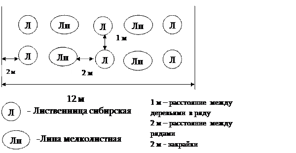 В полезащитной зоне я выбрал сочетание лиственницы сибирской с липой мелколистной(3:2). Лиственница – это зимостойкая порода, которая хорошо переносит задымление, живет до 500 лет, не страдает от засухи и жары, не прихотлива. Древесина лиственницы стойкая к гниению, поэтому ее используют в судостроении, в подводных и подземных сооружениях. Липа мелколистная - долгоживущая порода, очень хорошо сочетается с лиственницей.Расстояние между деревьями в ряду я выбрал 1 м, расстояние между рядами-2 м, и закрайки-2 м.