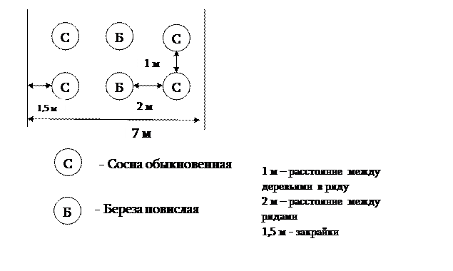 Расстояние между деревьями в ряду я взял равное 1м, расстояние между рядами - 2 м и закрайки – 1,5 м. Ширина моей лесополосы=2*2+2*1,5=7 м.