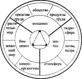 При наличии хозяйственного звена в структуру экосистемы следует включать нооценоз - совокупность средств труда, общества и продуктов труда. Таким образом, традиционная схема материально-энергетической единицы биосферы (биогеоценоз), включающая биоценоз и экотоп, преобразуется в новую схему материально-энергетической единицы техносферы - нообиогеоценоз . Техносфера - часть биосферы, преобразованная людьми с помощью прямого или косвенного действия технических средств и занятая продуктами производственной деятельности.