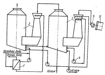 / — теплообменник; 2 — струйный газопромыватель второй ступени; 3 — струйный тазо-промыватель первой ступени; 4 — насос; 5 — дымосос; 6 — печь.