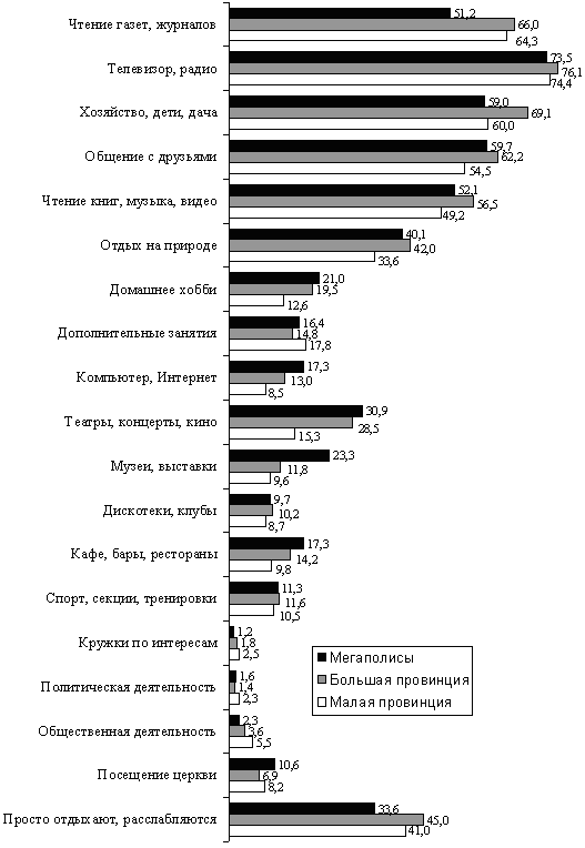 Тем не менее, недостаточность некоторых элементов «столичной» досуговой активности компенсируется в провинциях (особенно в крупных городах и областных центрах) тягой к самообразованию, чтению, общению. По этим показателям провинции не только не отстают, но иногда и опережают столицы. Кроме того, надо отметить, что даже такой не слишком популярный в России компонент досуга как общественно-политическая деятельность (участие в работе собраний, клубов, кружков, партий, ассоциаций), явно выше в провинциях, чем в мегаполисах.[2]