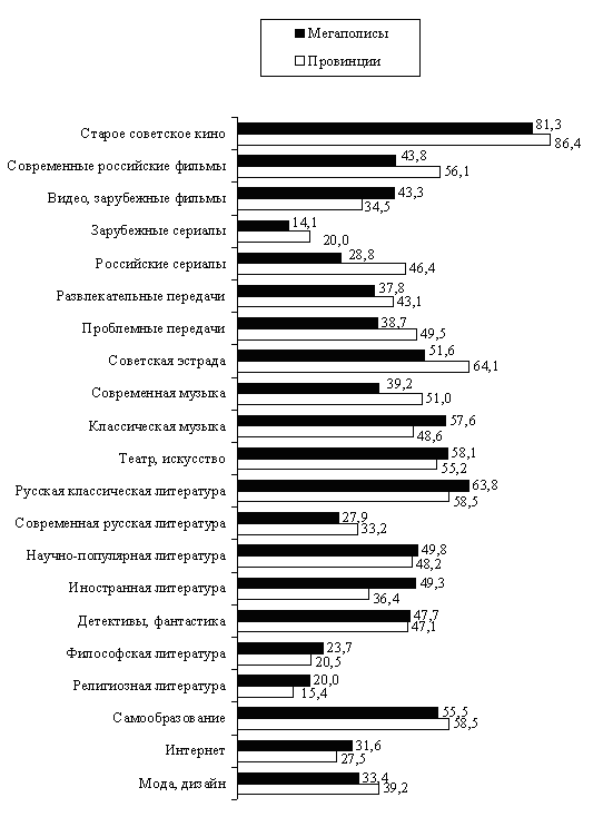 В этой связи следует обратиться к анализу структуры духовных интересов населения России, понять, насколько она дифференцирована (и дифференцирована ли вообще) в поселенческом разрезе. Соответствует ли устоявшийся в массовом сознании образ столицы как центра образования, развития и культуры более высоким духовным запросам людей, населяющих современные мегаполисы, и насколько здесь отстают (если отстают) провинции? [3]