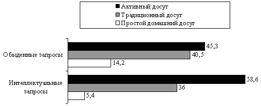 Очевидно, что самые распространенные и не требующие никаких дополнительных затрат домашние формы проведения свободного времени (телевизор, чтение, хозяйственные заботы или просто ничегонеделание) при отсутствии любых социальных контактов вне дома и любых попыток как-то разнообразить свой досуг внутри дома представляют собой самый «простой» тип досуговой активности. Добавление к этим домашним «развлечениям» тех или иных увлечений, включая книги, музыку, видео, занятия компьютером, самообразование, различные хобби, более активное общение, направленное на пребывание вне семьи с друзьями, обогащает свободное время, а также несет в себе более выраженный развивающий компонент. Такой тип досуга не только более разнообразен, но и более «традиционен» для России.