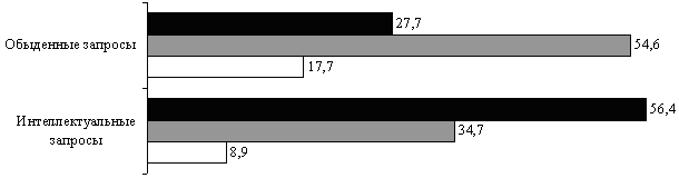 Если рассмотреть духовные запросы жителей мегаполисов и провинций с этой точки зрения, то обнаружится, что не менее 55% жителей обеих столиц, 53,3% жителей большой и 41,3% населения малой провинции обладают ярко выраженным интеллектуальным запросом. Именно эта доля российского населения в своем подавляющем большинстве любит театр, искусство (таких среди них до 80% как в мегаполисах, так и в провинциях, при том, что среди «обывателей» они нравятся лишь каждому третьему); 75,2% и 87,4% «интеллектуалов» из столиц и провинциальных российских городов стремится к самообразованию (этот важнейший компонент досуга присутствует всего у 29,0% «обывателей» независимо от места проживания); от 80% до 90% ценят русскую классику, увлекаются классической музыкой (люди с обыденными запросами из столиц и провинций только в каждом пятом случае). Наконец, именно «интеллектуалы» являются основными зрителями проблемных телевизионных передач (53,7% в мегаполисах и 66,1% в провинциях на фоне 18,2% и 32,6% среди «обывателей»). [3]
