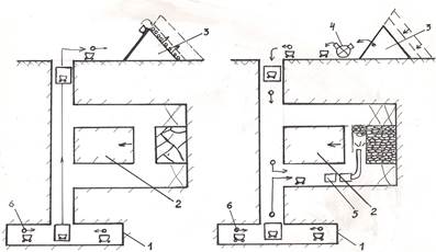 Рисунок 1 – Схема породного господарства шахти 1-місце видобутку породи, 2-очисний вибій, 3-породний відвал, 4-порододробарка, 5- породозакладальний комплекс, 6- напрямок грузопотоку породи.