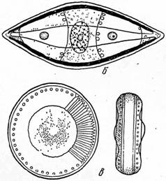 Рис. 1. Диатомовые водоросли: а — пиннулярия; б— навикула, или лодочка; ; г — мелозира