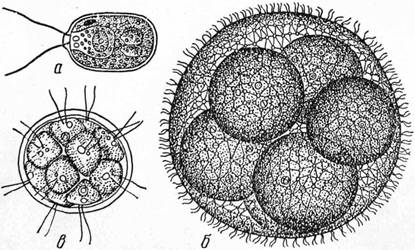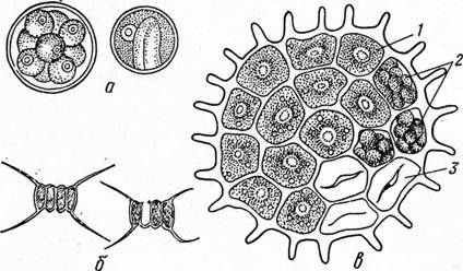 Рис.3 а — хламидомонада; б — вольвокс; в—пандорина