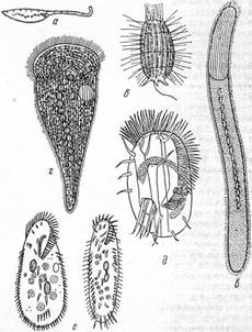 о — лакримария; б— колепс; в — спиростом; г — стентор, или трубач; д—эуплотес; е—окситриха и стилонихия.