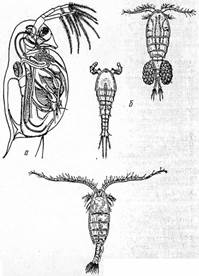 а — дафния пулекс; б — циклоп (справа — самка, слева —