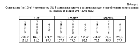 Анализ сохранности Р-активных веществ в продуктах переработки плодов вишни через 3...6 месяцев хранения показывает, что в среднем она высокая и уменьшается в ряду: сок – компот – варенье (таблица 1).