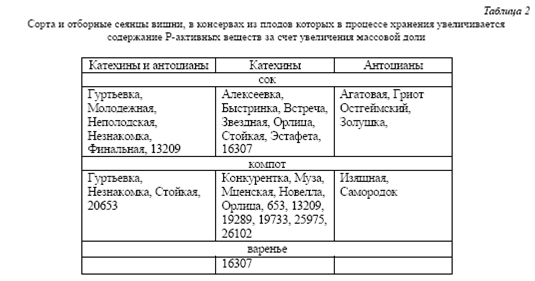 Консервы из вишни являются ценным источником Р-активных веществ, содержание которых часто выше, чем в свежих плодах, что обусловлено, очевидно, различной степенью термической обработки, влияющей на сохранность катехинов и антоцианов, и процессами образования из их полимерных молекул ценных мономерных форм, увеличивающих общее количество Р-активных веществ и влиянием на эти процессы сортовых особенностей.