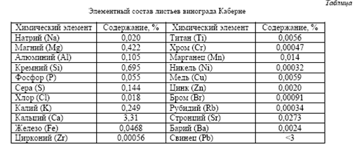 Элементный состав листьев винограда Каберне определен методом рентгенофлуоресцентного анализа (РФА). Основным преимуществом недеструктивного РФА перед методами анализа, предполагающими деструкцию исследуемого материала, является то, что на измерение образцы поступают без разрушения их основы химическим или термическим воздействием, поэтому информация о составе сохраняется без изменений. Кроме этого РФА характеризуется хорошей воспроизводимостью измерений, высокой производительностью и сравнительно низкой стоимостью анализа.