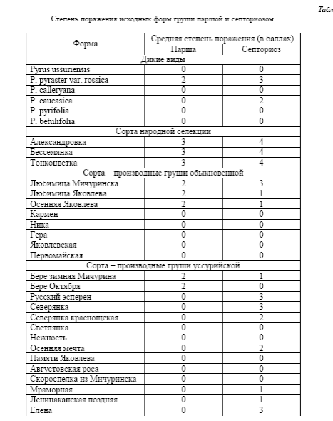Устойчивость груши уссурийской и сортов полученных на ее основе к микозам