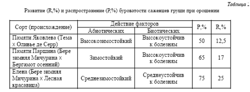 Возбудителем ржавчины является гриб Gymnosporangium sabinae (Dicks.) Wint., который развивается на основном растении-хозяине - можжевельнике, в то время как промежуточным является груша, где происходит развитие эцидиальной стадии - Roestelia cancellata Rebentish [4]. Возбудитель развивается в начале лета при условии повышенной влажности и искусственного орошения. На исследуемом участке восприимчивость к ржавчине отмечена на сорте Памяти Яковлева (P=100%, R=43, 75%).
