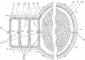 После снижения концентрации в воде вредных веществ до предельно допустимых норм вода сбрасывается в водопоглощающую скважину 11, откуда поступает в водоносный слой грунта. Очистка загрязненного на полигоне твердых отходов инфильтрата производится за счет многократной фильтрации воды через толщу водоносного слоя и биологической очистки в секциях сборного резервуара растениями (например, камыш и др.), чем и обеспечивается защита грунтовых вод от загрязнения. Поддержание уровня грунтовых вод внутри контура полигона ниже уровня грунтовых вод (за контуром) исключает переток загрязненных вод через противофильтрационную завесу 1, причем контроль над уровнями вод ведется по скважинам 7. Поверхностные воды по канаве 8, оборудованной лотками, отводятся в канавы 13, откуда попадают в грунт и повышают уровень грунтовых вод с внешней стороны завесы 1 секций 2 сборного резервуара, что также препятствует фильтрации загрязненной воды из секций сборного резервуара.