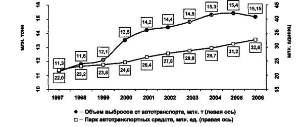 Анализ динамики выбросов загрязняющих веществ в атмосферный воздух Российской Федерации от передвижных источников за последние 10 лет показал [3], что из всего многообразия передвижных источников автомобильный транспорт остается главным загрязнителем атмосферного воздуха. На его долю приходится около 42 % суммарных по России выбросов загрязняющих веществ в атмосферу и 94,5 % - от транспортного комплекса. Интенсивный рост численности автомобильного парка обусловил существенное повышение уровня выбросов загрязняющих веществ. При этом наиболее быстрыми темпами расширяется парк легковых автомобилей и автобусов, парк грузовых автомобилей увеличивается в три раза медленнее. Как видно (см. рисунок),
