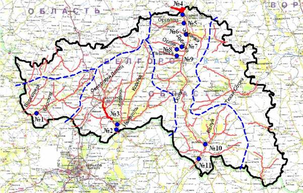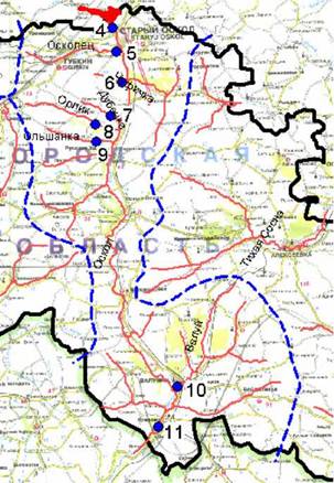 Рис. 4. Бассейн р. Оскол и ее притоков (пунктирные линии) и точки № 4-11 отбора проб воды