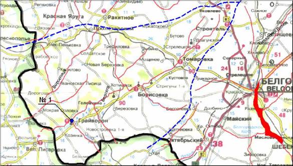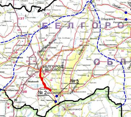 А). Бассейн реки Ворскла. Водосборный бассейн р. Ворскла на территории Белгородской области имеет площадь около 2700 км2 (см. рис. 1 и рис. 2). Точка отбора № 1, как видно из рис. 1, 2, расположена на мосту при выезде из города Грайворона. Данная точка отбора характеризует загрязнение р. Ворскла на выходе из Белгородской области и одновременно - радиоактивное загрязнение, которое уходит через границу области.