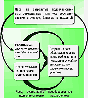 | Рис. 16. Схема динамики таежных лесов, связанной с подсечно-огневым земледелием. Основная часть лесов, существенно преобразованных подсечно-огневым земледелием, приходилась на случайно выжженные участки и вторичные леса, сформировавшиеся на их месте и на месте заброшенных подсек. За счет этого площадь таких лесов многократно (в десятки или сотни раз) превосходила площадь единовременно использовавшихся подсек. Даже при небольшой плотности населения значительная доля удобных для земледелия земель в южной и средней тайге была так или иначе вовлечена в подсечно-огневое земледелие. С другой стороны, основная нагрузка приходилась именно на леса, удобные для земледелия (в том числе и с точки зрения доступности). За счет этого часть наиболее удаленных или неудобных лесов подвергалась расчисткам крайне редко или не подвергалась вовсе. |