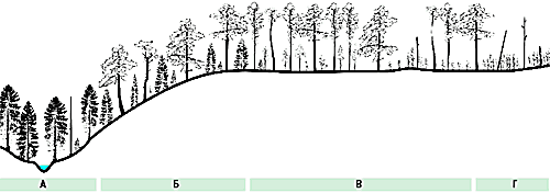 | Рис. 17. Схема структур древесного яруса, формирующихся под воздействием лесных пожаров (пример): А - пожарный рефугиум (участок, в течение длительного времени - превышающего срок жизни одного поколения деревьев - избегавший воздействия пожаров); часто такими рефугиумами оказываются избыточно увлажненные долины рек и ручьев, но иногда в силу случайных причин такие участки могут сохраняться и на хорошо дренированных территориях. Б - участок, давно не подвергавшийся воздействию огня; под пологом соснового древостоя (одновозрастного или разновозрастного) успел сформироваться второй ярус ели, отдеьные деревья которой уже начинают “выходить” в верхний ярус древостоя. В - разновозрастный сосновый лес, сформировавшийся под воздействием более или менее периодически повторяющихся низовых пожаров. Каждый из таких пожаров обеспечивает возможность формирования нового поколения сосны, одновременно с этим значительно ускоряя отпад деревьев старших поколений. Г - участок, пройденный верховым пожаром, уничтожившим практически весь исходный древостой. Верховой пожар создает условия для формирования густого соснового подроста, дающего начало одновозрастному сосновому древостою. |