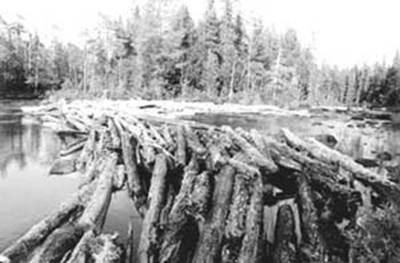 | Рис.14. Одним из важнейших результатов промышленного «освоения» лесов Европейского Севера стало засорение таежных рек утерянной или брошенной при сплаве древесиной. Республика Карелия, Пяозерский лесхоз, река Таванга. |