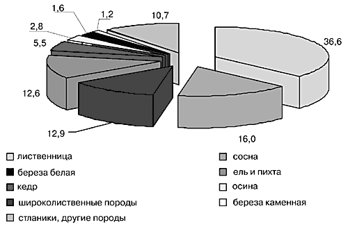 Рисунок 1. Распределение российских лесов по группам пород (в % площади)
